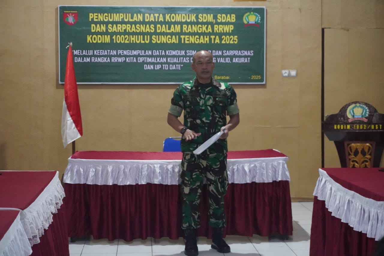 Lensakrimin@—BARABAI – Kodim 1002/Hulu Sungai Tengah melaksanakan kegiatan Pengumpulan Data Komduk (Komunikasi Dukungan) Sumber Daya Manusia (SDM), Sumber Daya Alam dan Buatan (SDAB), serta Sarana Prasarana Nasional (Sarprasnas) dalam rangka Rencana Pembinaan Wilayah Pertahanan (RRWP) Tahun Anggaran 2025, Rabu (12/11/2025).